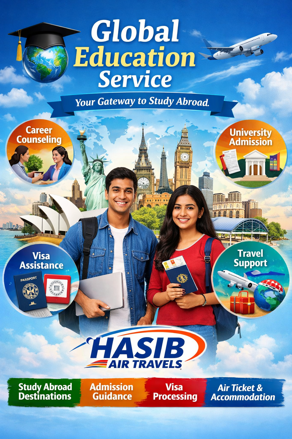 In today’s interconnected world, global education has become a powerful pathway for personal growth, professional excellence, and international understanding. Hasib Air Travels plays a vital role in turning this aspiration into reality by offering reliable and comprehensive Global Education Services to students who dream of studying abroad. Hasib Air Travels is committed to guiding students at every step of their international education journey. From the initial stage of career counseling to the final stage of overseas departure, the organization ensures a smooth, transparent, and well-structured process. Students receive personalized guidance in selecting suitable countries, universities, and academic programs that align with their educational background, financial capacity, and long-term career goals. One of the key strengths of Hasib Air Travels lies in its expert support for admission processing. The team assists students with university applications, documentation, statement of purpose preparation, and compliance with international academic requirements. By maintaining close coordination with foreign institutions, Hasib Air Travels helps students secure admissions in reputed universities across the globe. Visa guidance is another crucial aspect of the Global Education Service. Hasib Air Travels provides professional assistance in preparing visa files, ensuring accuracy, completeness, and compliance with embassy regulations. Through careful counseling and ethical practices, the organization increases the likelihood of visa success while maintaining full transparency with students and guardians. Beyond education consultancy, Hasib Air Travels offers complete travel solutions, including air ticketing, travel planning, and pre-departure briefings. Students are well informed about accommodation options, travel formalities, and cultural adaptation, allowing them to begin their academic life abroad with confidence and peace of mind. In conclusion, the Global Education Service of Hasib Air Travels stands as a trusted bridge between ambition and achievement. With professionalism, integrity, and student-focused service, Hasib Air Travels continues to empower aspiring students to access world-class education and build a successful global future.